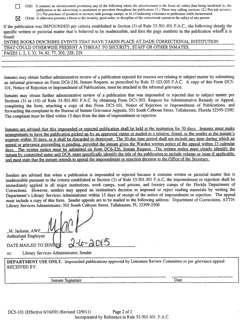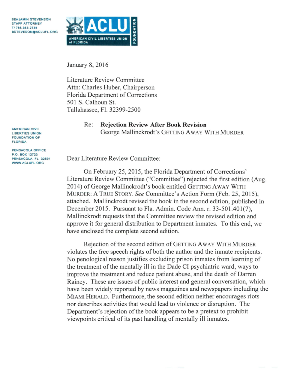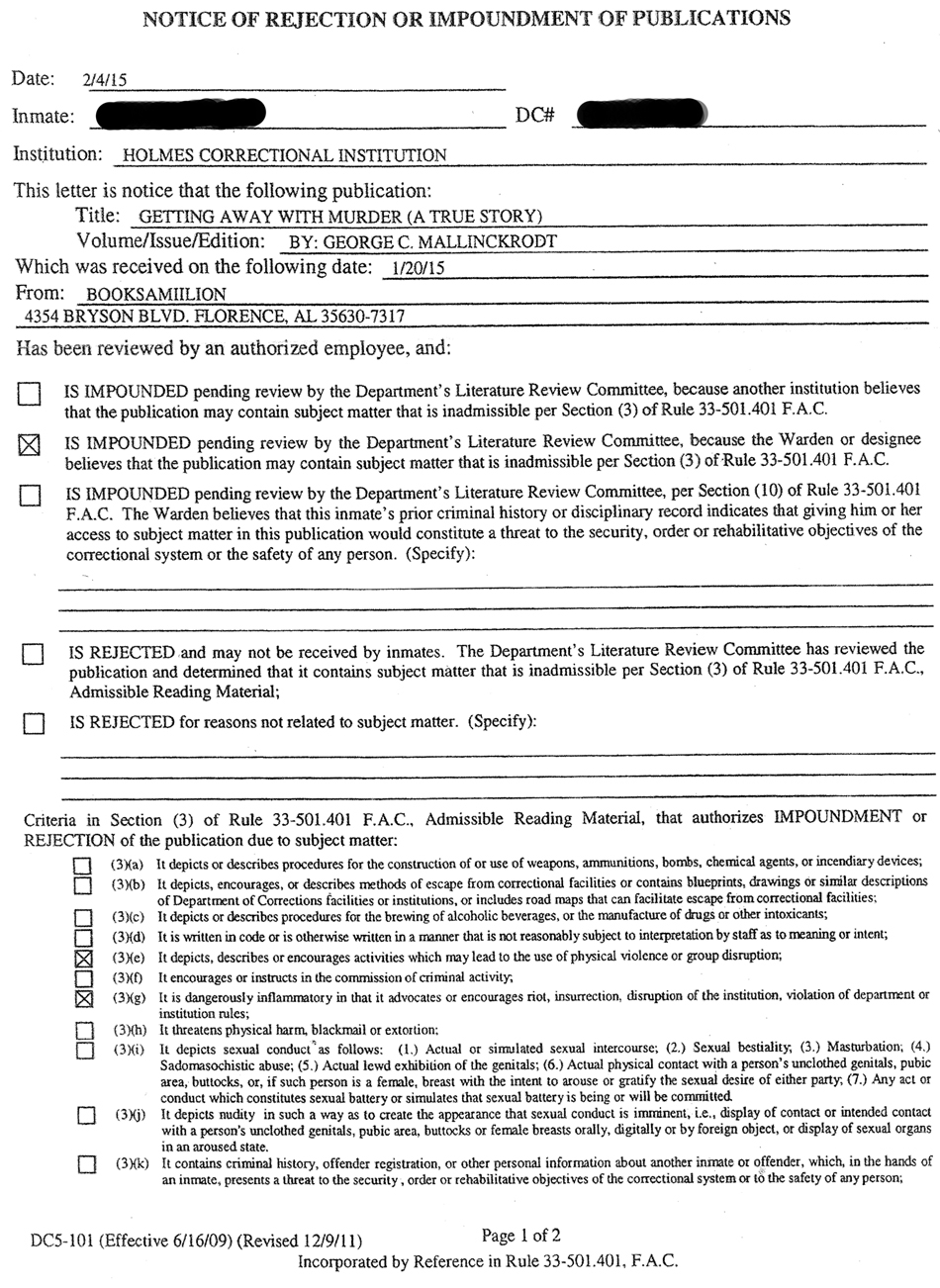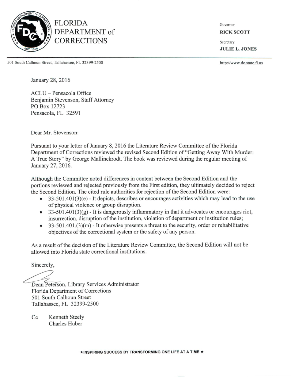 DEC 29, 2015 - A source inside the Florida Department of Corrections said on condition of anonymity, "This book could cause a prison riot!" Another department official cited this rationale for the ban: "It's a true story, right?" "Right." "That would have been one of the reasons…had it been a novel or fiction it would've been OK."
