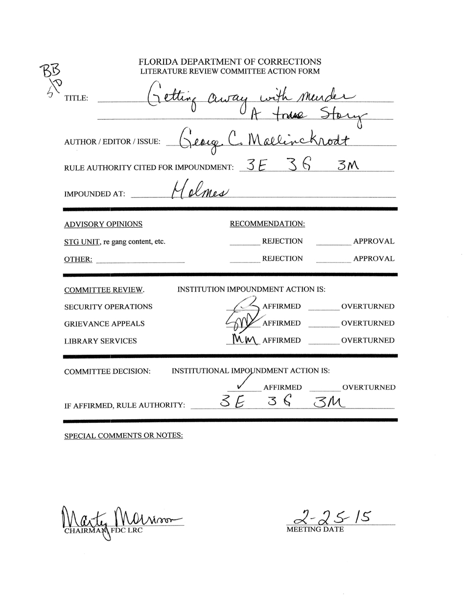 George's Note: The package the FDC sent me included 12 copied pages from Getting Away With Murder to substantiate their claims that my book "depicts, describes, or encourages activities which may lead to the use of physical violence or group disruption." Another false assertion the FDC made about GAWM was that "it is dangerously inflammatory in that it advocates or encourages riot, insurrection, disruption of the institution…" I never encouraged anybody to start a prison riot in my book! Finally, the DOC claims my book "presents a threat to the security, good order, or discipline of the correctional system or the safety of any person." The only "threat to the security, good order, or discipline" is the DOC itself and the fact that Secretary Julie Jones continually glosses over the 800-pound gorilla in the room: The deeply embedded culture of brutality and secrecy.